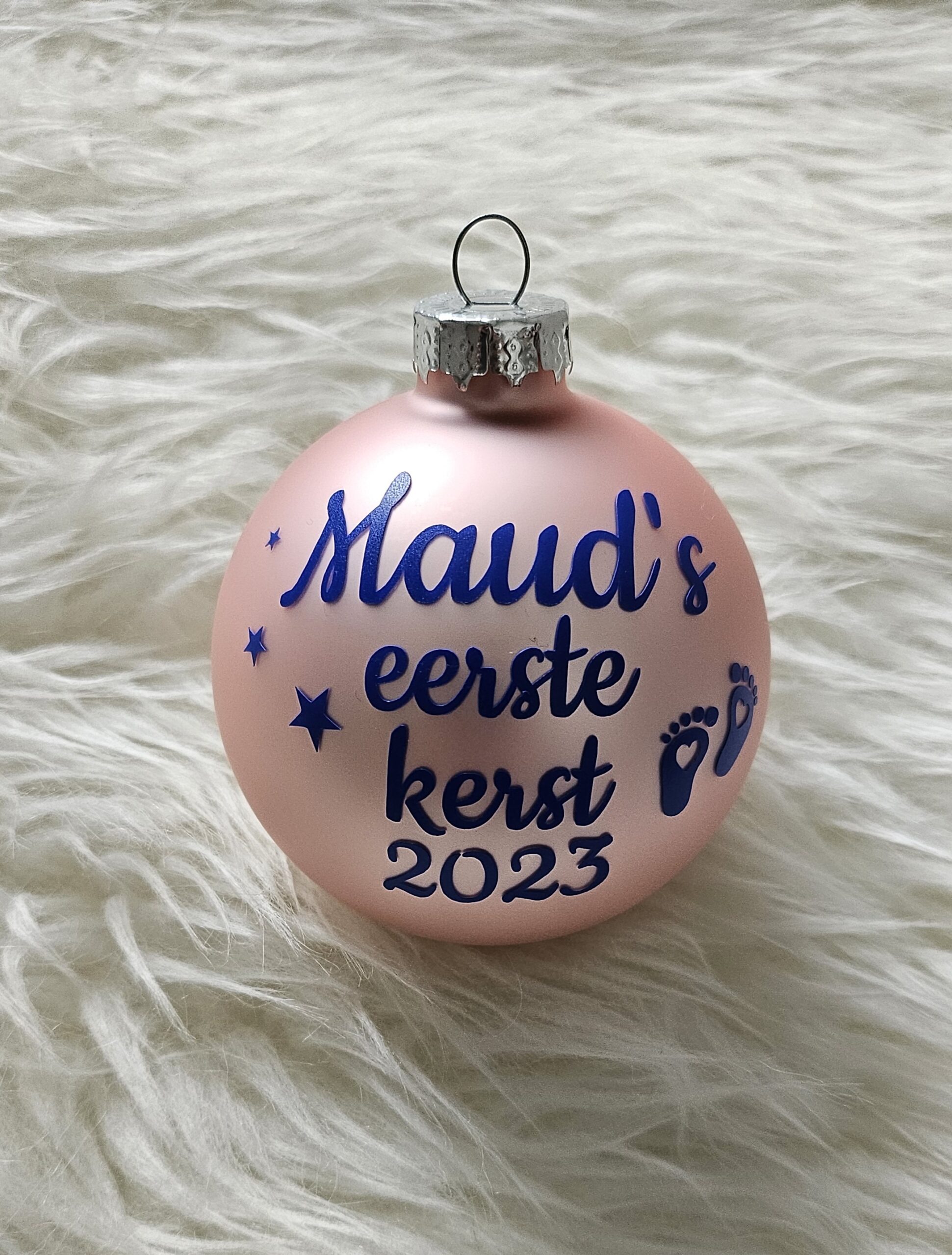 Mooie glazen kerstbal met naam en geboortejaar of geboortedatum met babyvoetjes en sterretjes.